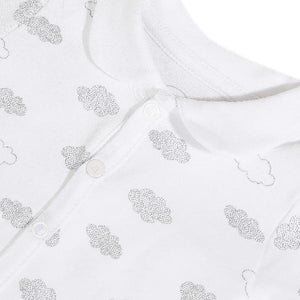 A white cotton sleepsuit by Absorba featuring a collar and a clouds print. It closes with popper fastenings down the front and between the legs.
